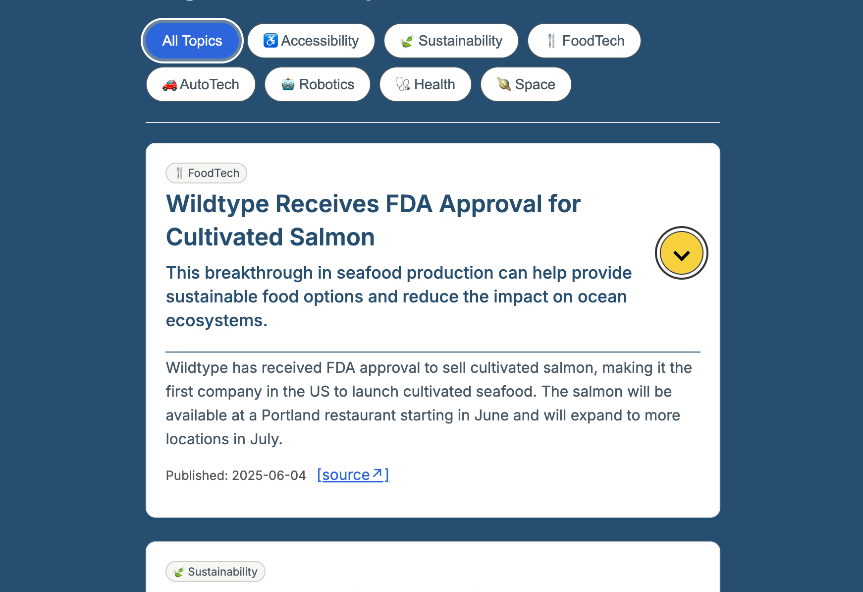 - Filter out only positive sentiment news, limited to 30 posts per day (not to overwhelm with long lists, save cost on API calls, and website loading time)